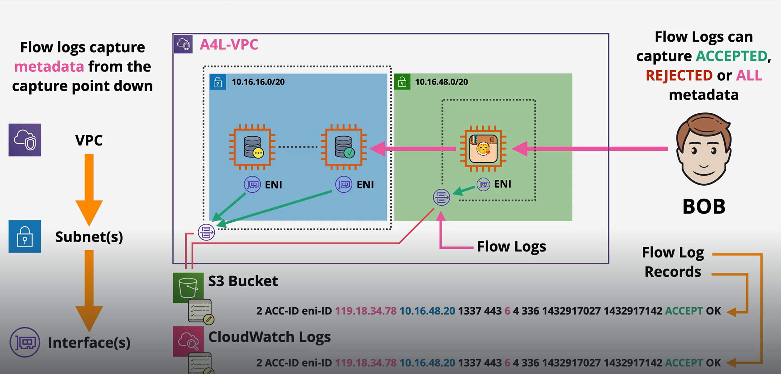 * VPC Flow Logs = visitor book where every attempt to enter/exit is recorded.